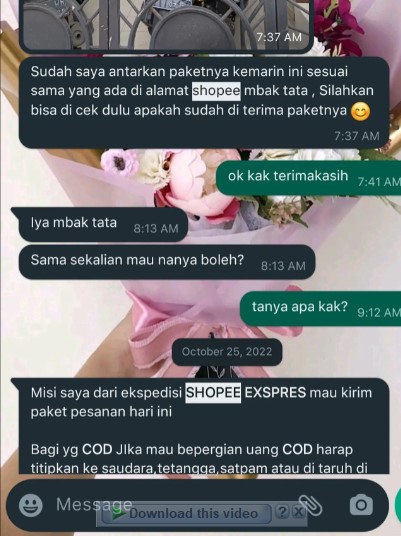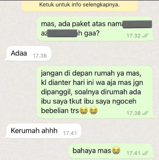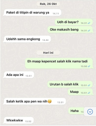 Adanya aplikasi chattingan kini memberikan kemudahan untuk banyak orang saling berbagi kabar. Tak hanya bisa mengirim pesan kepada orang yang dikenal, aplikasi chattingan juga bisa digunakan untuk mengirim pesan kepada orang yang tidak dikenal, salah satunya kurir. Dengan aplikasi tersebut, kurir bisa lebih mudah mengabari pelanggan ketika akan antarkan pesanan. Selain mengirim pesan 'bernada' serius, rupanya ada kurir yang mengirim pesan sekaligus ajak konsumen bercanda, penasaran? Yuk cek aja dibawah ini..