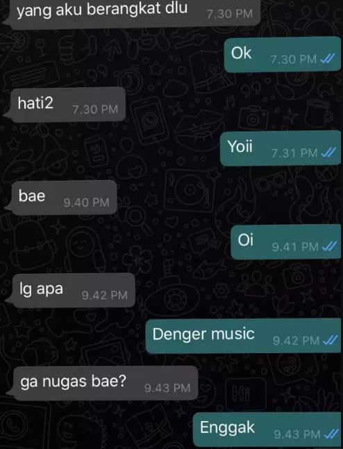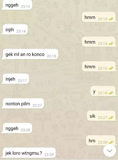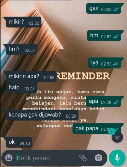 Yang Penting Heppiii. Cara komunikasi tiap orang pasti beda-beda, tergantung kebiasaan masing-masing. Termasuk saat membalas pesan. Ada yang suka banget ngetik panjang lebar di chat, sampai nggak terasa menghabiskan waktu berjam-jam. Tapi nggak sedikit juga yang balas chat nya suka singkat-singkat, dan ngetik seperlunya aja. Seperti beberapa potretnya berikut ini, yang mungkin agak kelewat singkat dan bikin gemes bacanya. Simak deh.