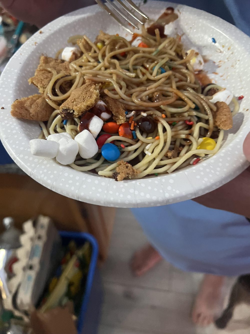 2. Apa rasanya spageti dicampur manisan kenyal, permen, dan kukis? Gak paham lagi
