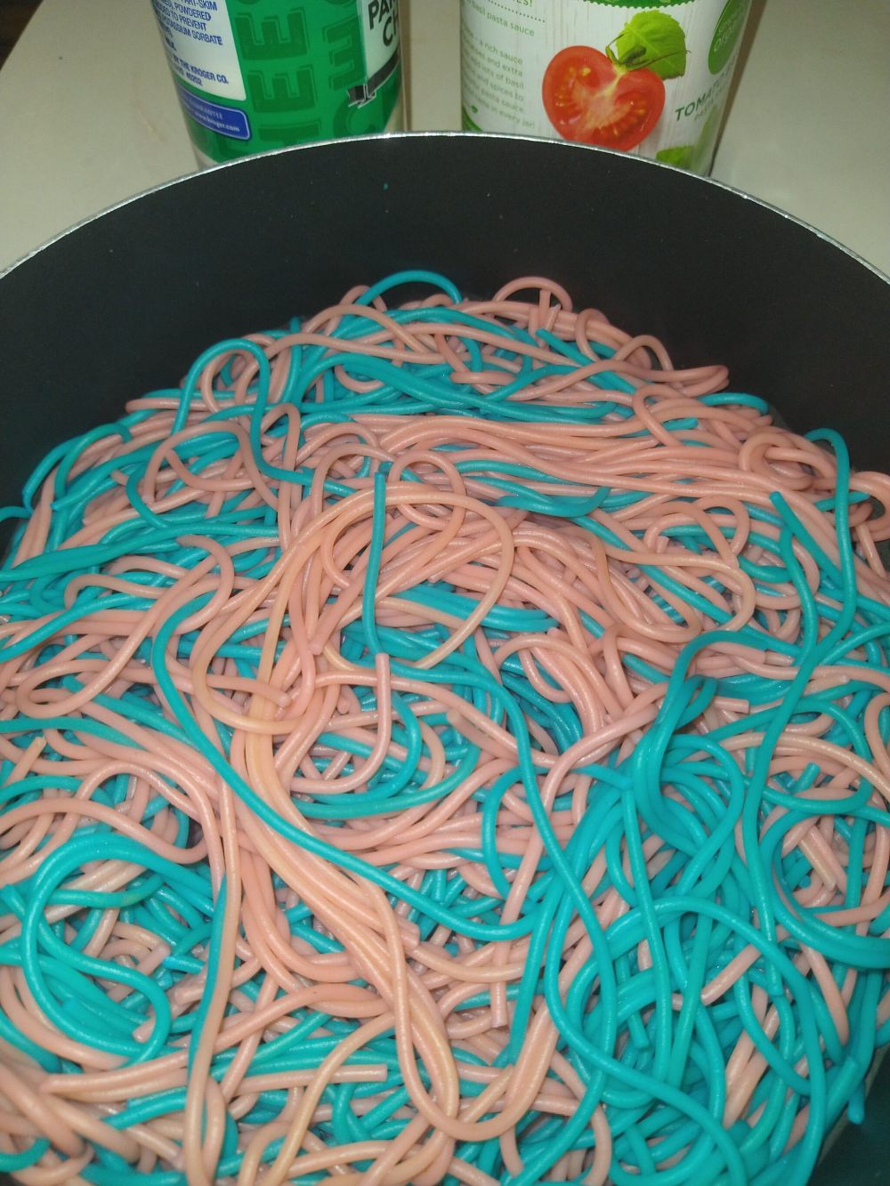 3. Ternyata warna juga bisa bikin selera berubah. Aneh banget warna spagetinya, ya