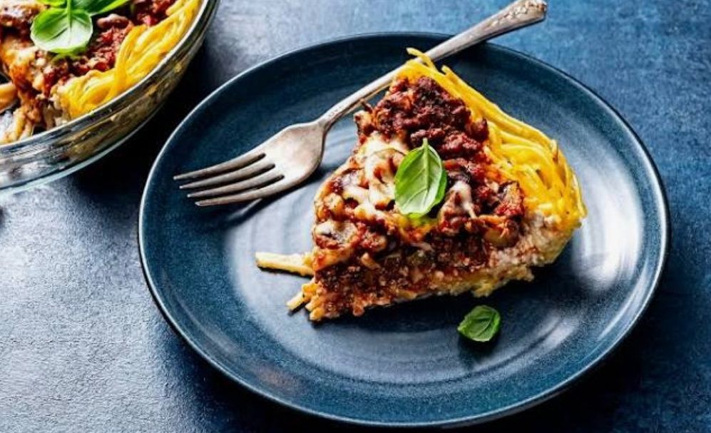 6. Spageti ini disajikan dalam bentuk kue pai. Sekalian aja bikin yang bentuk kue ulang tahun. Capek, deh