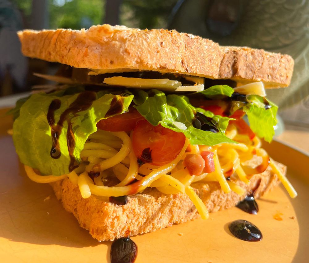 7. Walau banyak sayurnya, spageti sandwich ini punya dua karbohidrat
