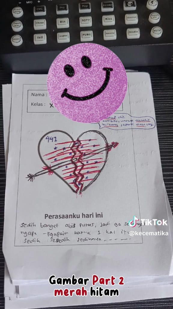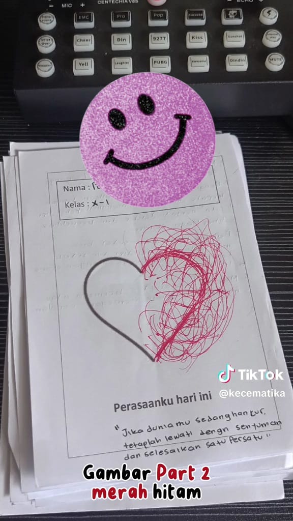 Sedangkan gambar dasar yang dibuat pengunggah berbentuk emoji setengah hati. Tak hanya itu, guru juga meminta siswa mengungkapkan perasaannya pada kertas gambar. Hasilnya, hasil karya siswa luar biasa dan melebihi ekspektasi.