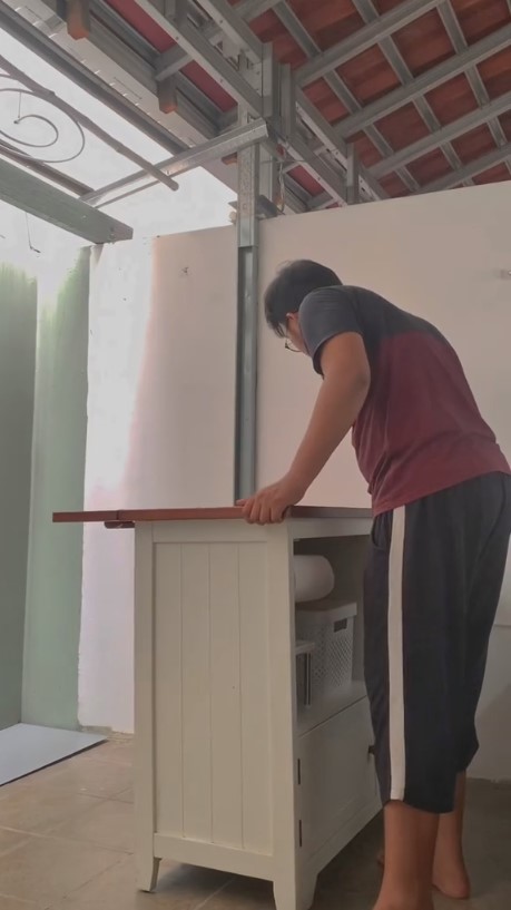 - Ia juga mengubah tampilan meja dapurnya dengan menambahkan sticker vinyl.