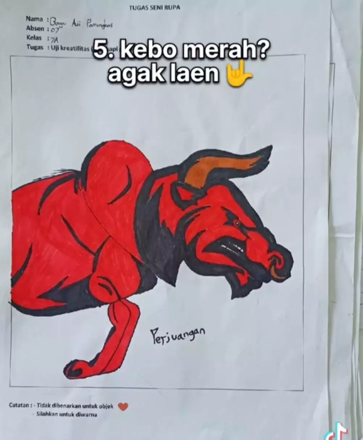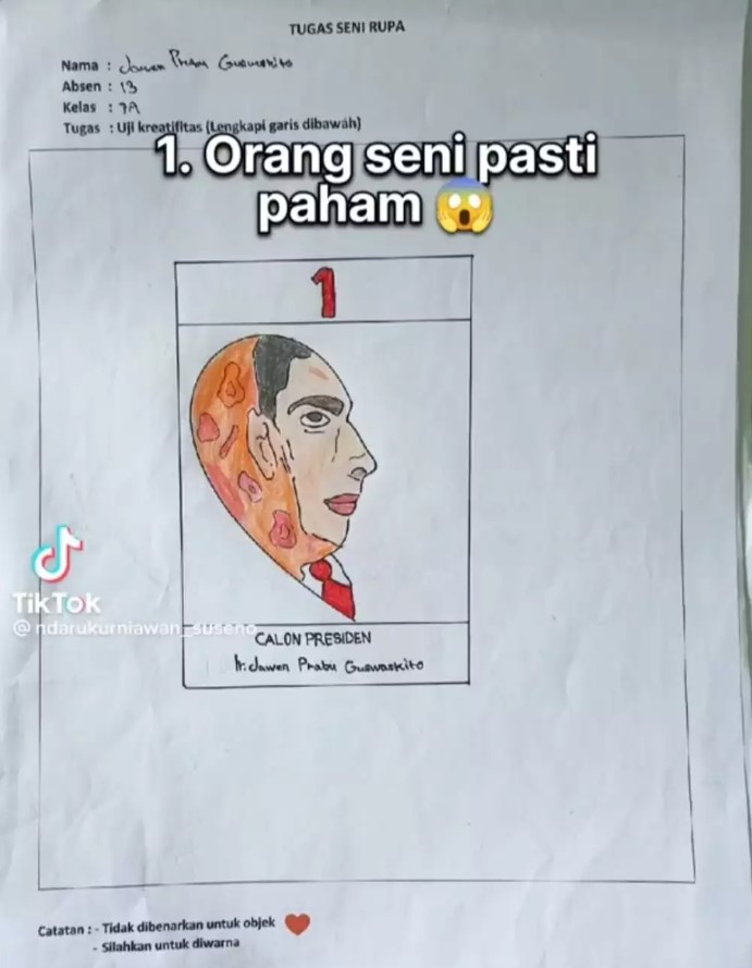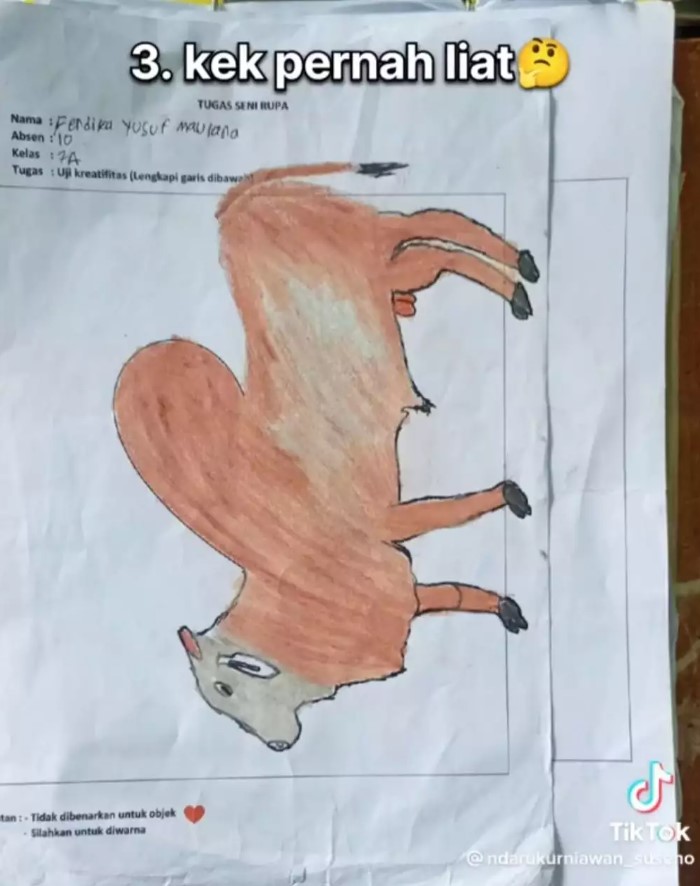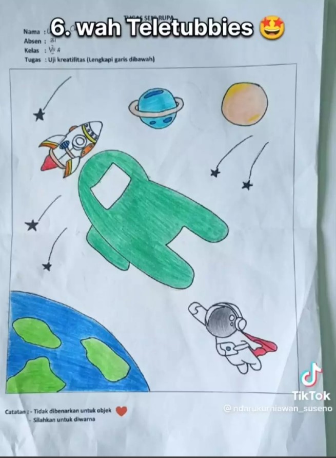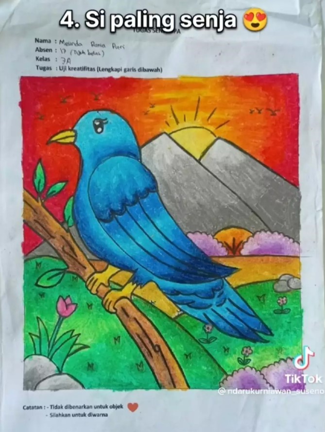 Kelas seni merupakan salah satu mata pelajaran favorit siswa. Dan jika guru cukup kreatif dalam menciptakan bahan ajar, pembelajaran bisa lebih dari sekedar modul atau buku teks. Jika gurunya kreatif, besar kemungkinan siswanya juga akan terinspirasi karena setiap siswa harus kreatif dalam dirinya sendiri. Hanya saja kreativitas mungkin bersifat terpendam. Jadi, Anda memerlukan percikan untuk menyalakan kreativitas. Tentu saja kreativitas siswa pertama-tama dirangsang dengan tugas-tugas yang sama menariknya. Artinya, siswa diminta menggambar sesuatu dari garis yang digambar guru. Kalau penasaran yuk lihat langsung saja potretnya