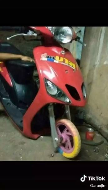 - Motor matic satu ini rodanya malah di modif pakai roda sepeda anak kecil.