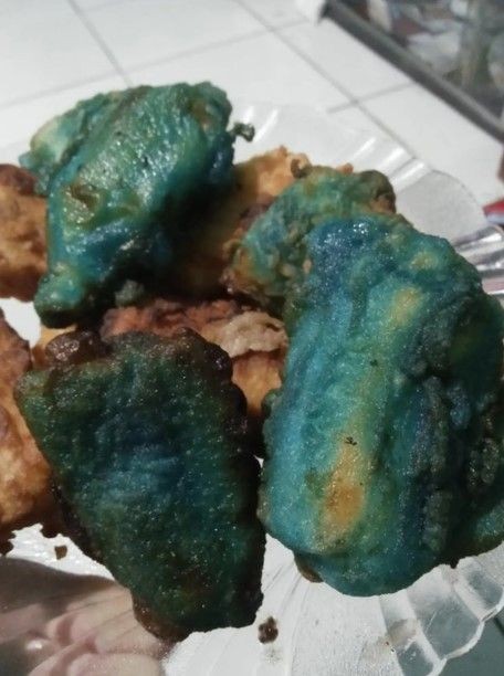 - Pisang gorengnya kelunturan apa, ya? Kok warnanya malah biru begini