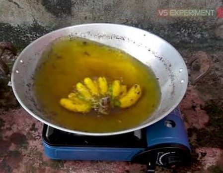 - Bentuk pisang gorengnya kenapa begini, ya? Mencurigakan~