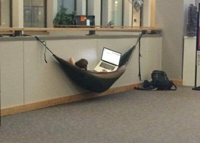 - Bosan kerja sambil duduk, bawa hammock ke kantor juga jadi salah satu ide bagus ni
