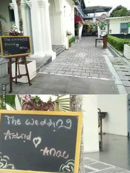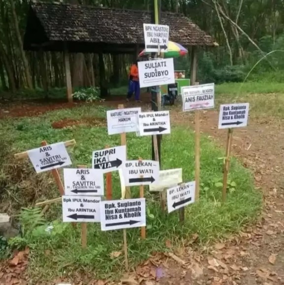 Apabila lokasi acara pernikahan terletak di dalam gang, petunjuk jalan tentunya sangat membantu tamu undangan. Petunjuk jalan tersebut biasanya diletakkan di beberapa sudut jalanan hingga sampai ke lokasi acara. Ada petunjuk lokasi yang dibuat dengan jelas sehingga memudahkan para tamu untuk sampai lokasi, namun tak jarang juga ditemukan petunjuk lokasi yang bikin tamu undangan bingung dan sangat tidak membantu. Seperti beberapa potretnya berikut ini, Yuk simak!