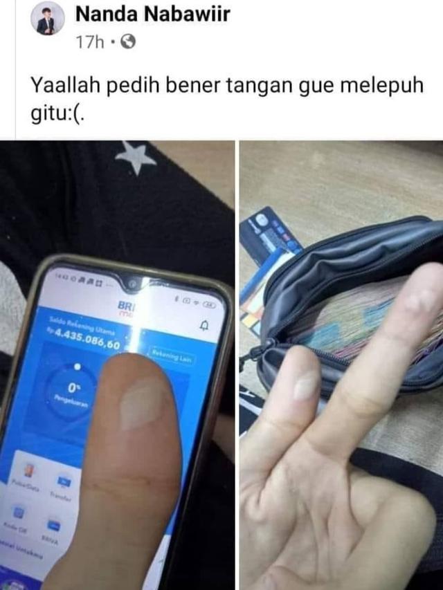 - Ingin mengeluh karena tangannya melepuh, di belakangnya sambil pamer isi rekening