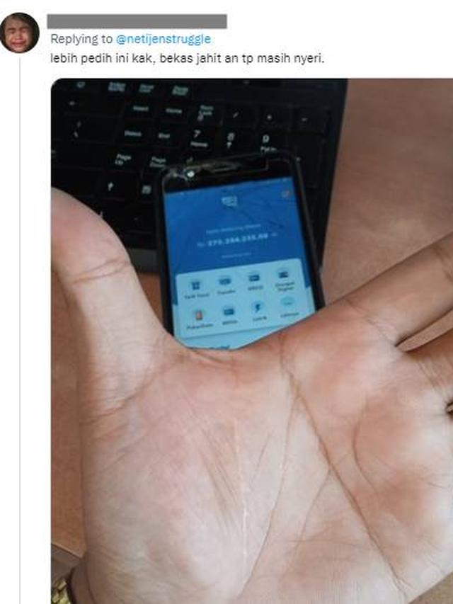 - Karena tangannya dijahit, makannya isi rekeningnya jadi tiga digit