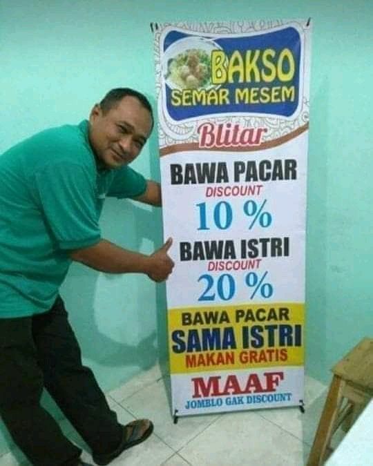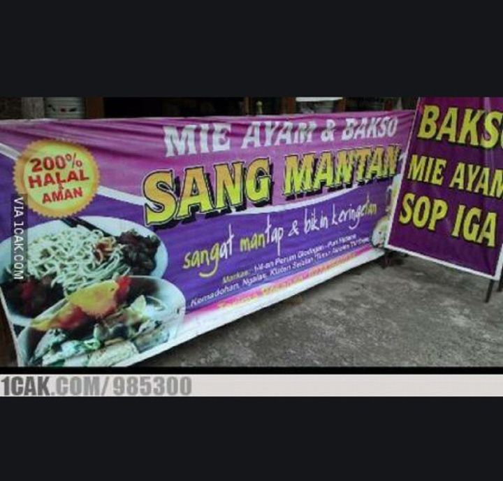 Bakso merupakan makanan yang terbuat dari daging dan disatukan dengan kuah ini memang jadi salah satu makanan favorit orang Indonesia. Hiingga, tak heran jika kamu sering menemui tukang bakso di pinggir jalan. Untuk bisa bersaing dengan para pedagang bakso lainnya, mereka menggunakan spanduk yang unik dan lucu untuk menarik perhatian pembeli. Penasaran? Yuk lihat dibawah ini..
