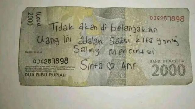 Rupanya, selain sebagai alat tukar legal dalam proses jual-beli, uang juga sering digunakan layaknya kertas biasa untuk menulis banyak hal lho. Apalagi dengan terus berpindah tangannya uang tersebut, banyak orang jadi bingung kepada siapa sih tulisan receh dalam uang kertas itu ditujukan.