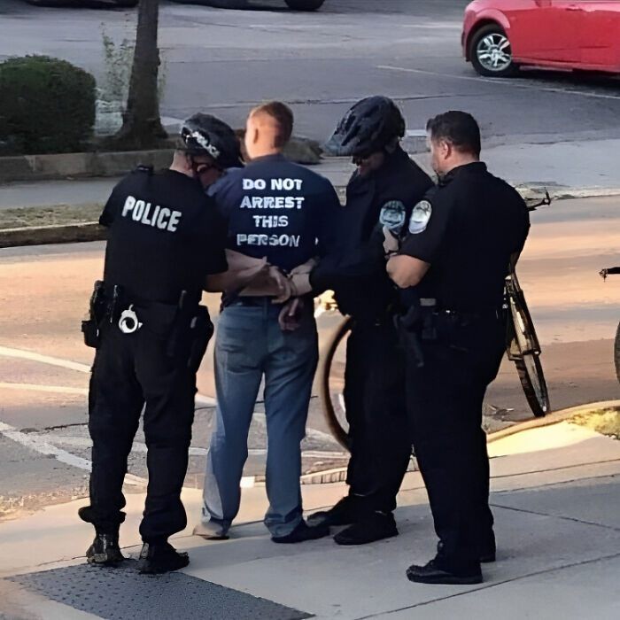 6. Polisi pas baca tulisan di punggung kaos pria itu pasti bilang, "Iya 'kah, manis? Astaga, ngerinya!" dengan nada ngeledek
