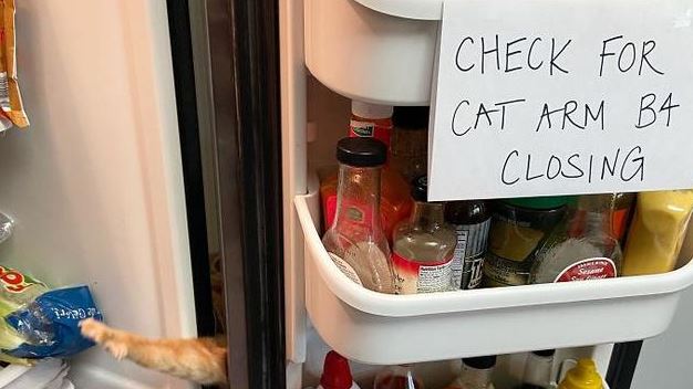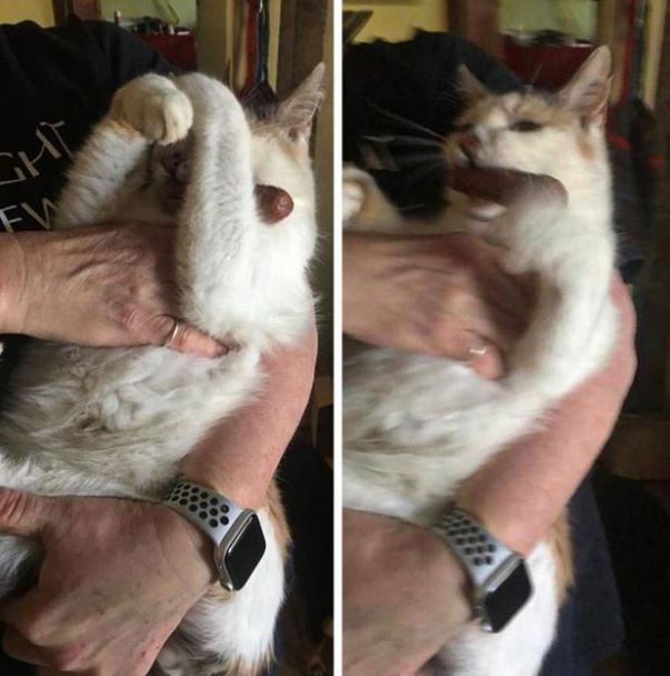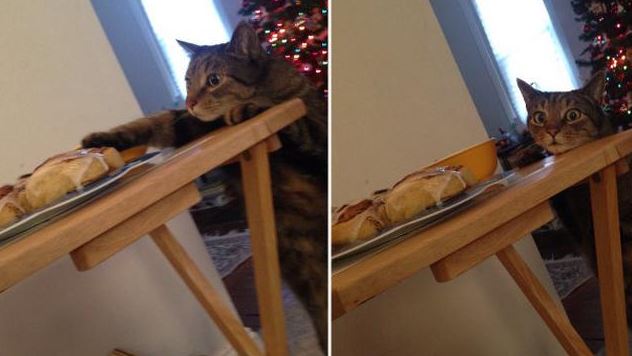 - Ketika si kucing malu karena sudah terlanjur menggigit sosis milikmu yang telah dicuri.