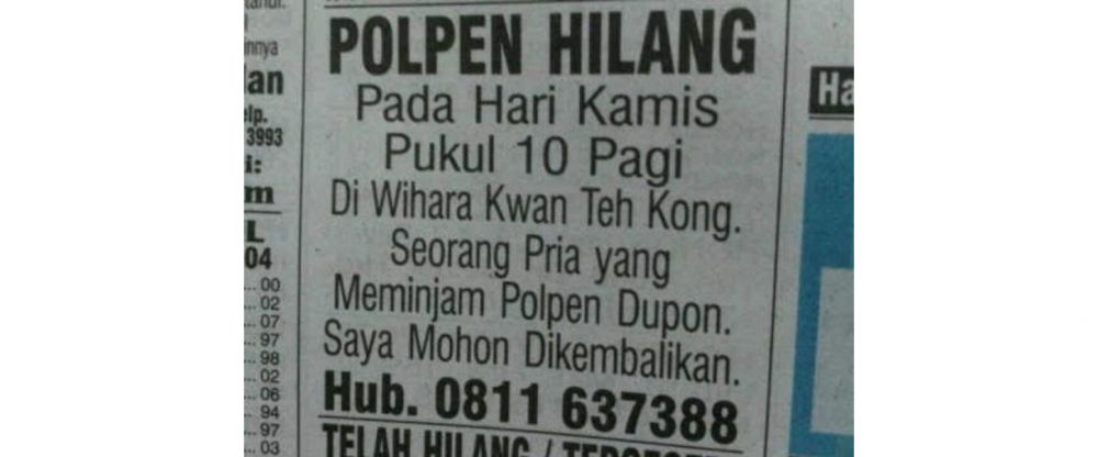 - Pulpen yang hilang pun sampai di posting ke iklan koran dong.