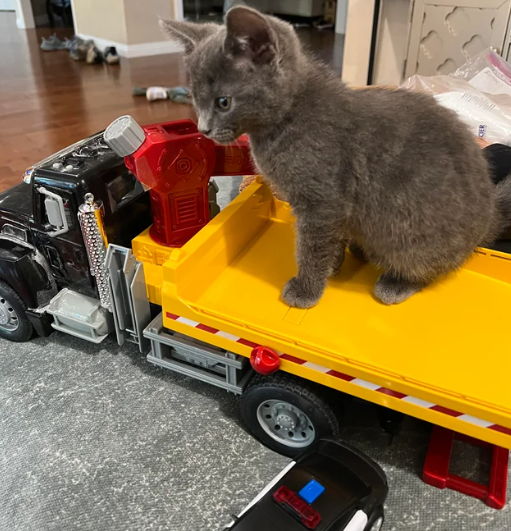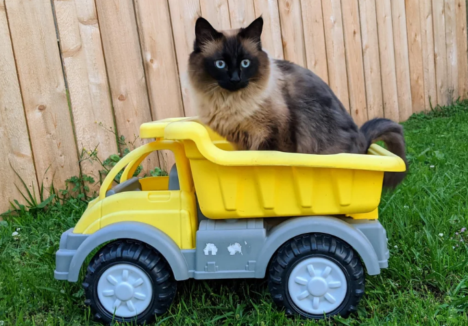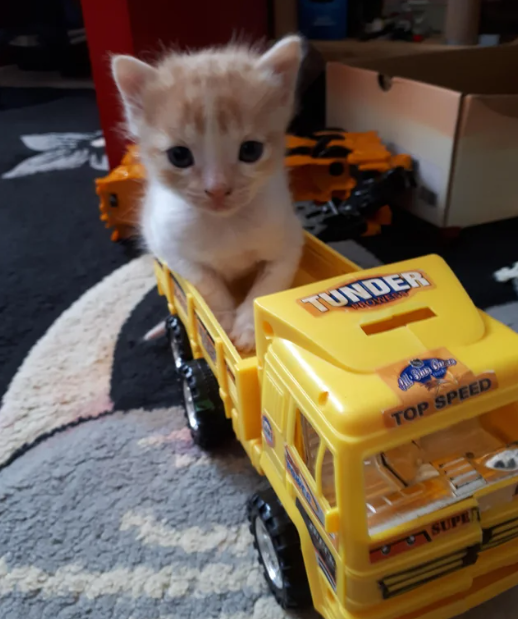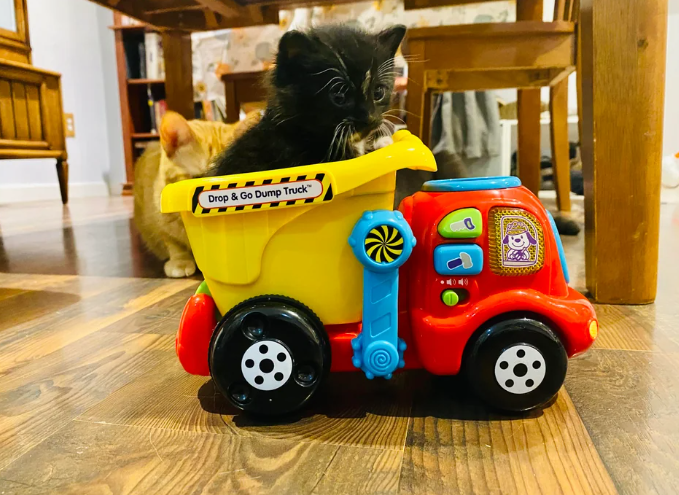 Jika kucing penasaran dengan suatu barang baru yang dilihatnya, pasti tertarik untuk mencobanya. Dan jika mereka menikmatinya, bersiaplah dan acara tersebut akan menjadi tempat favorit mereka. Misalnya, kucing mengendarai truk mainan ini.
