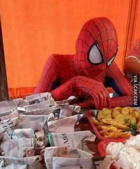 - Spider-Man mode akhir bulan nih, mampunya makan di angkringan aja.