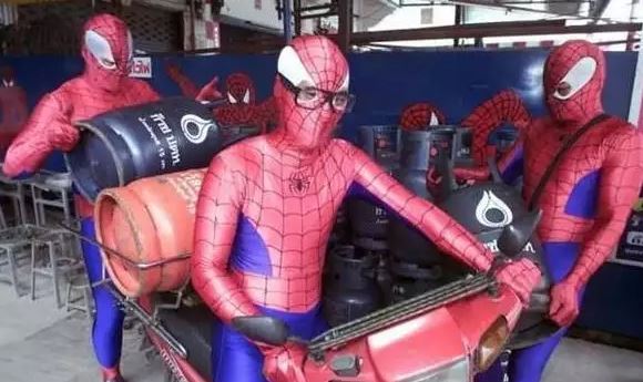 - Ketika Spider-Man dari berbagai universe gotong-royong mengantar gas LPG ke perumahan.