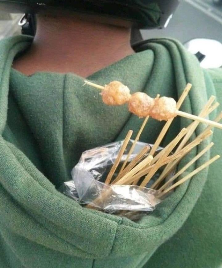 5. Bahaya nih kalau buru buru pakai helmnya, bisa bisa tumpah semua bakso nya