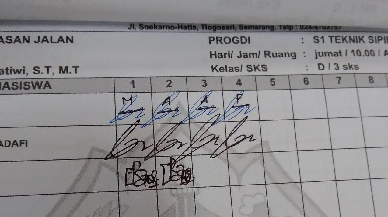 Perkuliahan merupakan masa yang tak terlupakan. Banyak momen lucu, menyedihkan, dan lainnya yang dialami oleh para mahasiswa. Salah satunya adalah ketika presensi kehadiran di kelas. Biasanya kehadiran mahasiswa ditandai dengan adanya tanda tangan mahasiswa tersebut. Tapi pernah gak sih lihat tanda tangan mahasiswa yang kocak seperti dibawah ini? Dijamin kamu bakaln cengar cengir melihatnya.