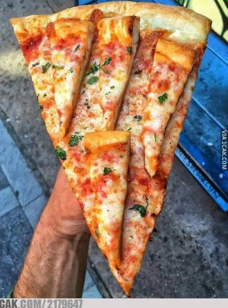 - Nggak cuman pizza-nya yang dipotong segitiga, toppingnya juga biar sama.