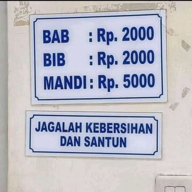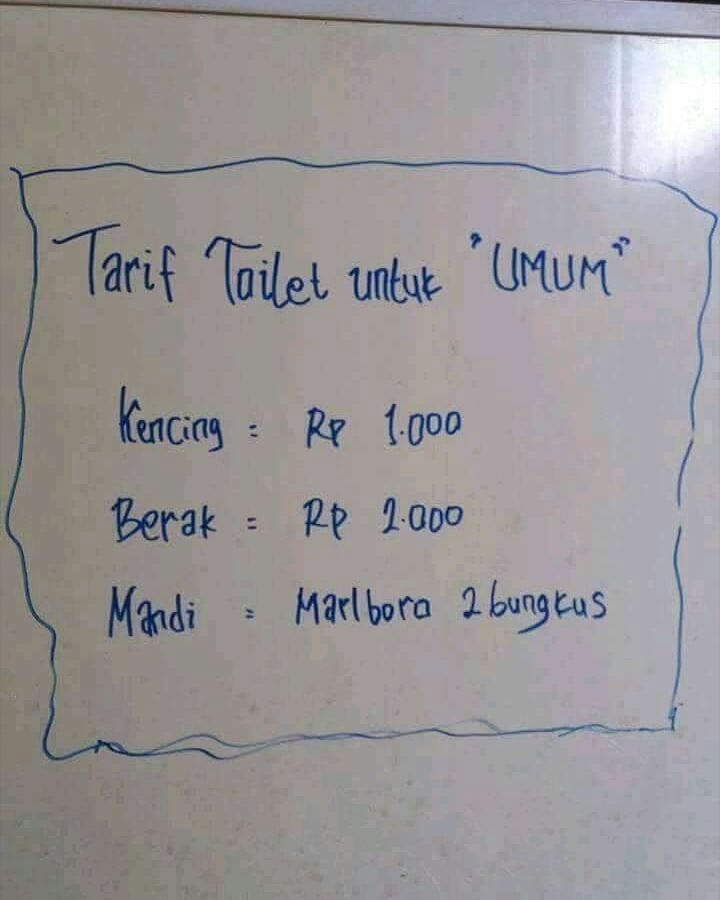 Namun demikian, nggak semua toilet umum menuliskan tarif secara jelas. Ada juga yang menuliskan dengan tarif nyeleneh dan bikin geleng kepala. Seperti deretan dibawah ini, dijamin bikin kamu ngakak!