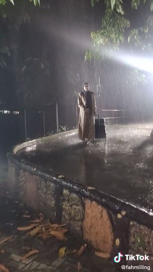 - Ada kru yang membuat suasana semakin penuh drama dengan membuat hujan buatan.