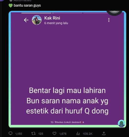 Memberi sebuah nama kepada anak, memang menjadi kewajiban setiap orang tua. Banyak orang tua zaman sekarang yang memberi nama dengan nama-nama yang kekinian. Bahkan tidak jarang, para orang tua muda ini meminta saran kepada netizen saat mencari inspirasi untuk memberikan nama kepada anaknya. Ada yang ingin menggunakan awalan huruf Q yang cukup jarang digunakan, dan berikut inilah beberapa nama berawalan huruf Q rekomendasi netizen yang bikin kita ngakak!
