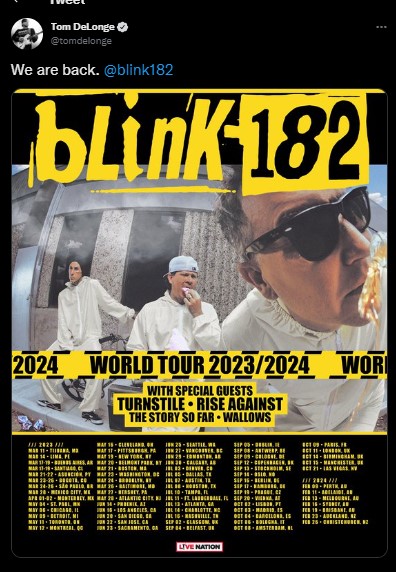 - Tom DeLonge ngeTweet ngumumin reunian dan tour dunianya