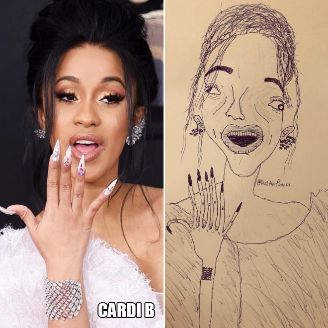 Yang Penting Heppiii. Seorang seniman asal Australia menggambar replika potret selebriti. Tapi bukan karya realis, pria yang sering mengunggah karyanya di akun Twitternya, @TwitterPicasso, menggambar karikatur aneh yang disengaja penuh dengan detail kecil yang terinspirasi oleh tato, pakaian, dan bentuk tubuh subjek, menawarkan gambaran yang sangat akurat tentang beberapa orang paling terkenal di industri hiburan. Scroll ke bawah deh untuk melihat sendiri contoh karya ‘terburuknya’ yang terbaik.