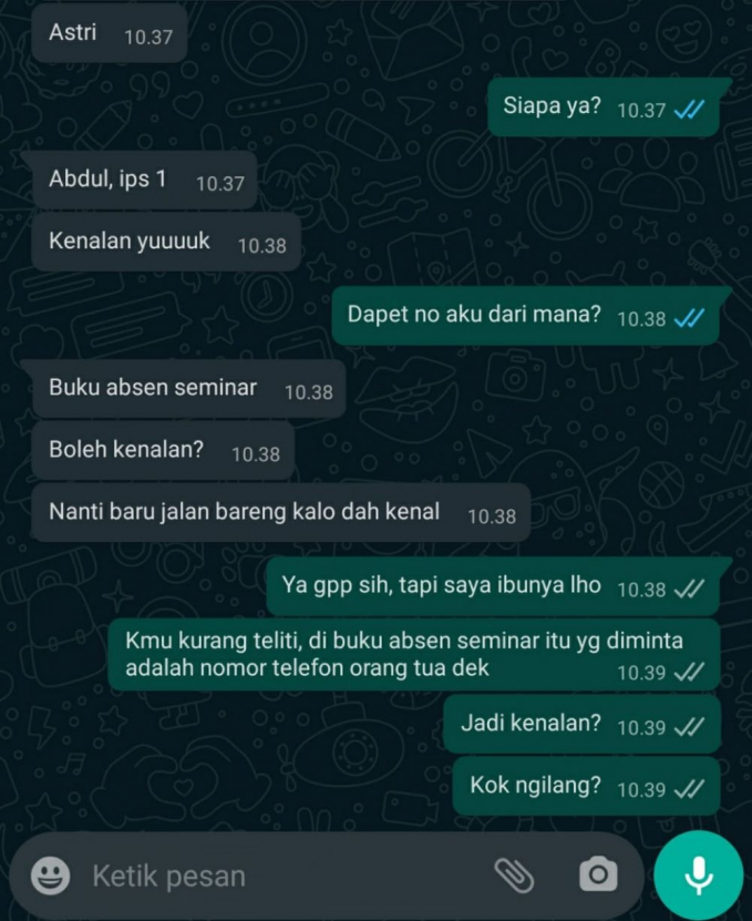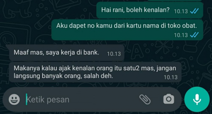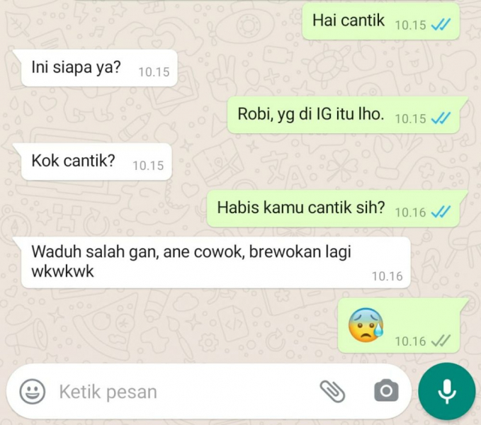 Yang Penting Heppiii. Kalo udah ngomongin era digital kaya sekarang, komunikasi apapun jadi gampang banget dilakukan, termasuk kenalan sama orang lain. Aplikasi pencari jodoh, sosial media seperti Instagram atau Twitter, sampai chat di Whatsapp adalah beberapa pilihan yang bisa kamu gunakan. Orang-orang di bawah ini juga melakukannya, sayangnya kok salah sasaran, ujung-ujungnya malah jadi masalah, mau perang jadi gagal deh. Cekidot guys, kocak banget.