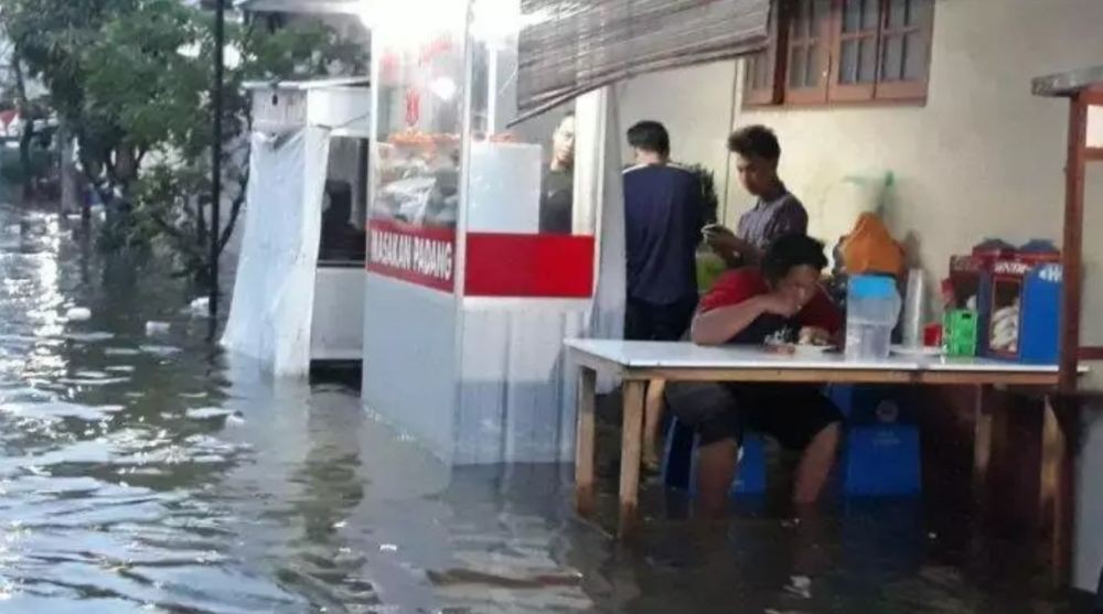 Tetep jualan walau bencana datang. Laper nggak bisa ditunda bos.
