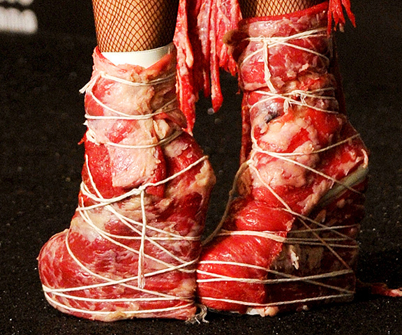 Siapa sih yang nggak tau Lady Gaga? Penyanyi konterversial pada zamannya itu emang suka membuat sensasi dengan gayanya yang unik. Pasti masih ingat dong tentang pakaian yang dia gunain pas konser? Nah, pelantun Poker Face ini juga menggunakan sepatu dengan ikatan daging mentah asli, lho. Hiih!