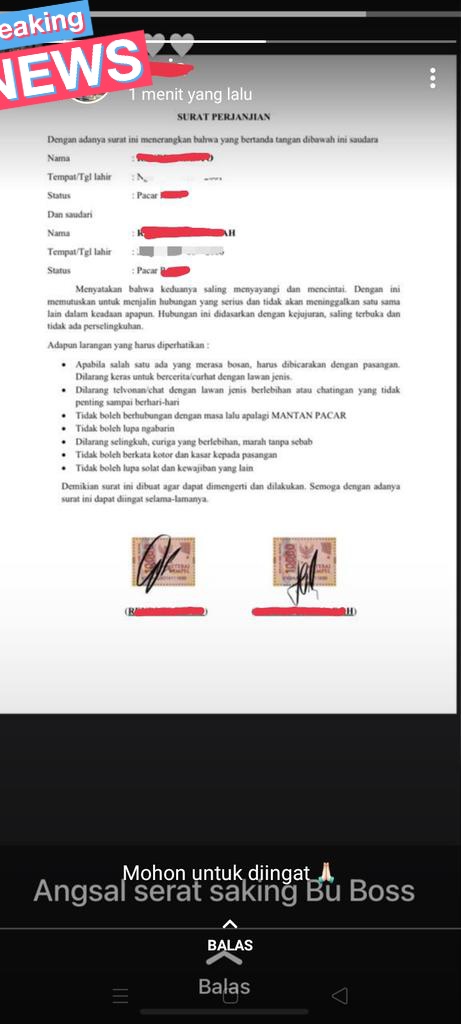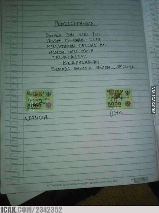Namun uniknya, beberapa orang justru membuat surat perjanjian untuk hal yang nyeleneh. Seperti dilakukan pasangan kekasih yang tengah dimabuk asmara. Tak ingin pasangannya mengulangi kesalahan sama, mereka pun membuat surat bermaterai. Penampakan itu pun nyeleneh dan bikin geleng kepala. Biar nggak penasaran , yuk simak.