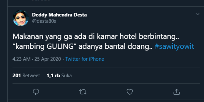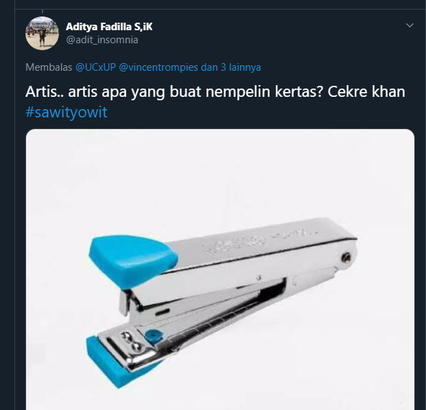 Berbagai konten menghiasi media sosial untuk menghibur netizen. Salah satu konten yang viral di Twitter adalah Sawit Yowit. Tanda pagar #sawityowit yang digagas Dedy Mahendra Desta bersama rekan host-nya Vincent Rompies dapat memucaki daftar trending di twitter. Mereka memberikan tebak-tebakan berisi jawabannya di akun Twitter mereka masing-masing. Tak disangka, cuitan mereka mencuri perhatian warganet. Bukannya lucu, malah tebakan mereka terkesan ‘garing’.penasaran seperti apa tebak-tebaknya? Yukk cek deretannya..