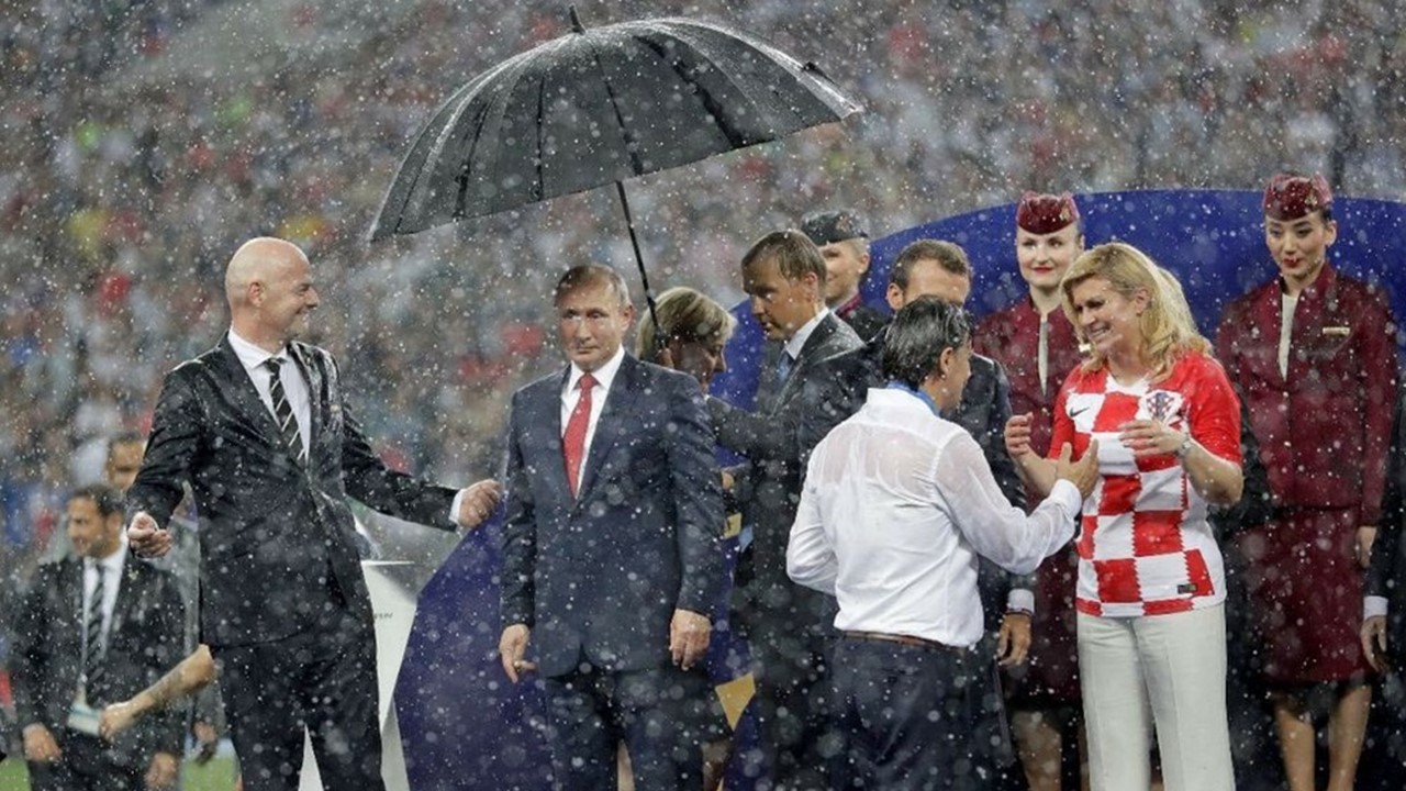 - Ada satu lagi kejadian yang nggak kalah jadi sorotan. Kita semua tau bahwa hujan turun deras ketika Perancis menang. Nah, pada saat penyerahan medali, terlihat bahwa hanya 1 orang yang benar-benar dipayungin, Vladimir Putin.