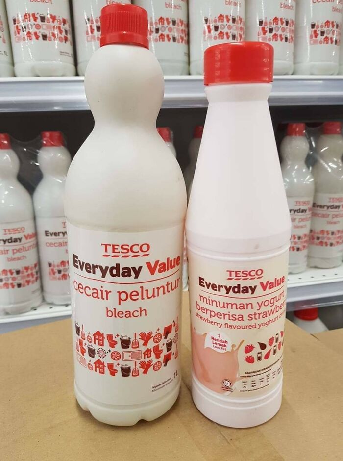 Harus banget ya pemutih baju sama yogurt kemasannya mirip banget.