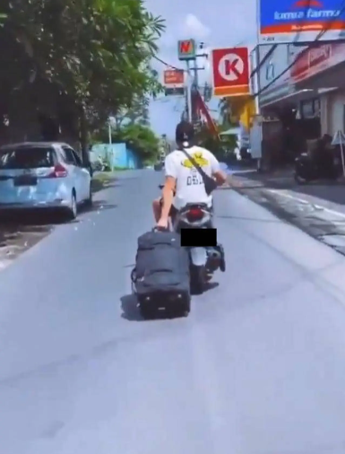 2. bule ini bawa koper dan tanpa mengenakan helm saat berkendara.