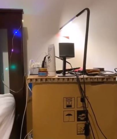 - Saking nggak punya meja, kardus bekas kulkas pun jadi alas lampu LED