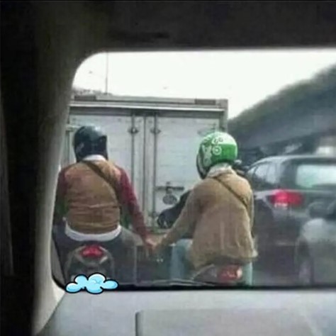 - Kayaknya baru jadian, sampe naik ojek yang beda aja tetep pegangan