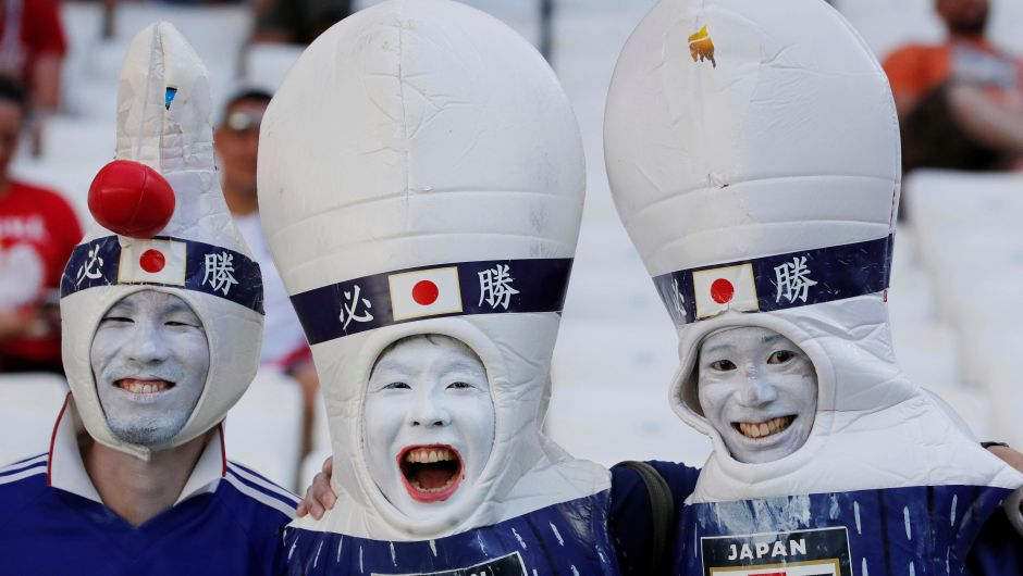 Jepang yang nggak pernah mati kalo soal kreatifitas, supporternya pura-pura jadi pin bowling, ngakak.