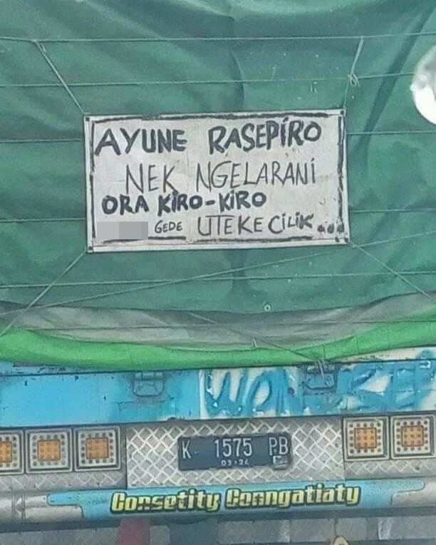 Sudah bukan hal asing lagi kalau truk yang biasa melintas di jalan kebanyakan dihiasi dengan tulisan. Ya, ada tulisan-tulisan nyeleneh yang suka disematkan oleh sopir atau pemilik truk. Makanya bisa dibilang truk ini identik dengan tulisan-tulisan kocak dengan tema keluarga hingga cinta.