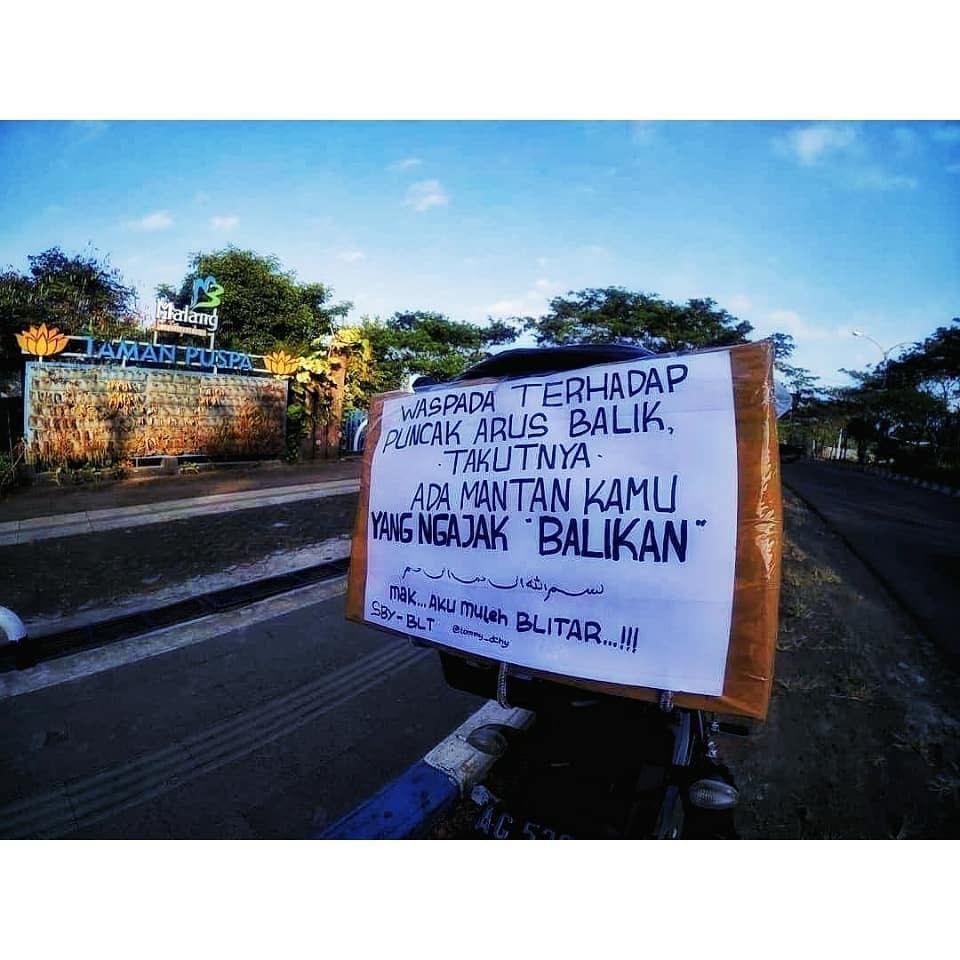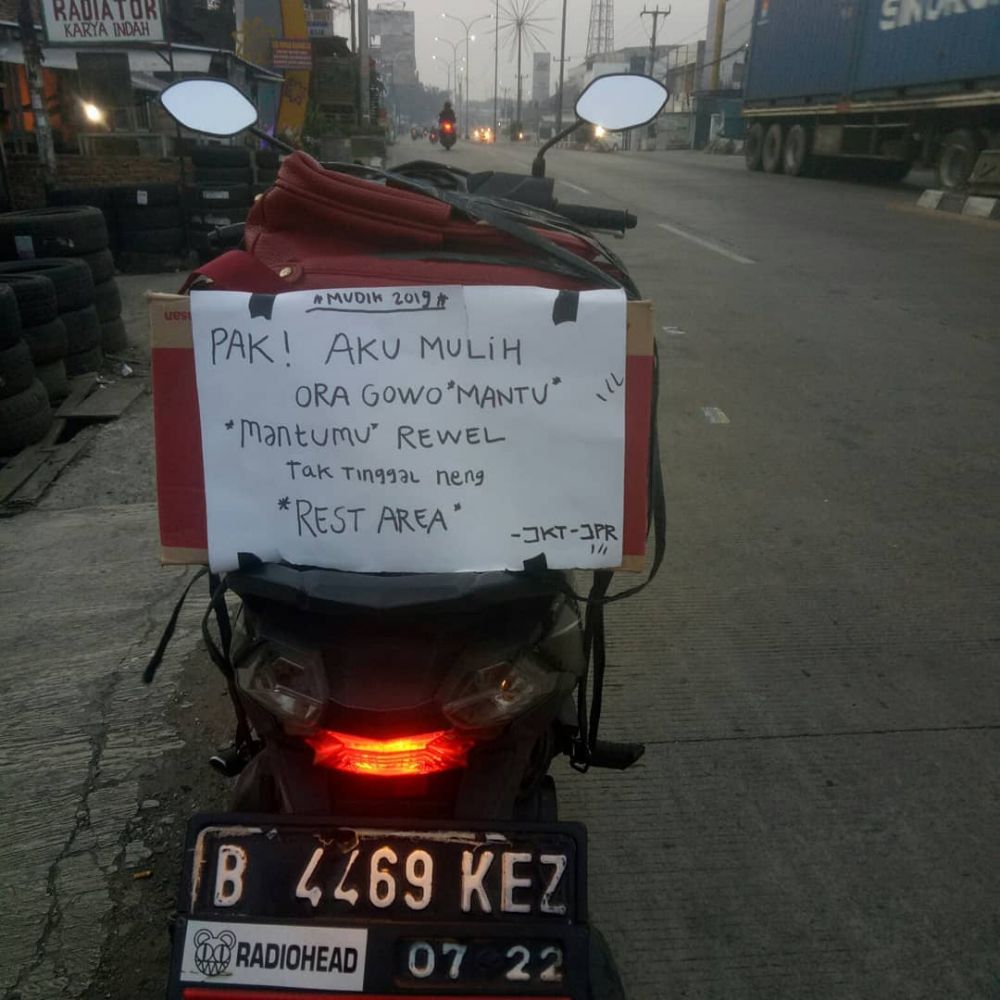 Mudik merupakan tradisi menjelang Lebaran setiap tahunnya. Di perjalanan mudik yang penuh dengan kemacetan banyak pemudik yang mengekspresikan ide kreativitasnya dengan tulisan-tulisan lucu yang sangat menggelitik.