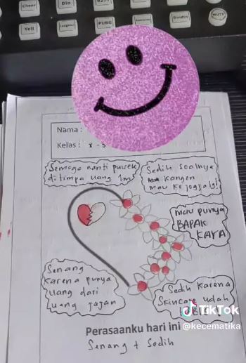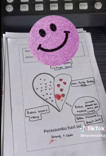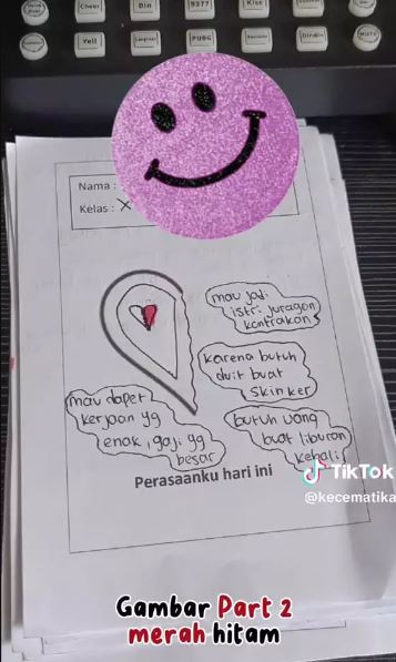 Yang Penting Heppiii. Tugas sambung gambar lagi ngehits banget, nih, terutama di pelajaran seni. Para guru suka banget kasih tugas ini karena bisa uji kreativitas murid, dan murid juga seneng karena nggak ribet pake alat-alat rumit. Tapi ternyata, tugas sambung gambar juga bisa buat baca ekspresi dan kepribadian murid, loh. Misalnya kayak yang ditunjukkan sama akun TikTok @kecematika. Dia kasih tugas sambung gambar bentuk setengah emoticon hati, trus suruh murid ungkapin perasaannya. Hasilnya? Karya murid yang ekspresif banget, diluar dugaan deh! Mau liat gambarnya langsung?