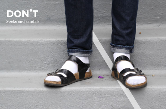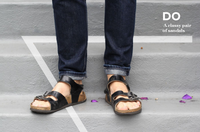 Sandal. Jangan sekali-kali pake kaos kaki kalau pake sandal, kaya orang sakit. Apalagi kalau kaos kakinya di luar, sakit jiwa beneran dah.