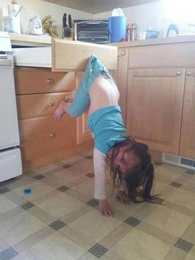 - Ingin turun dari meja dapur, tapi celananya malah tersangkut